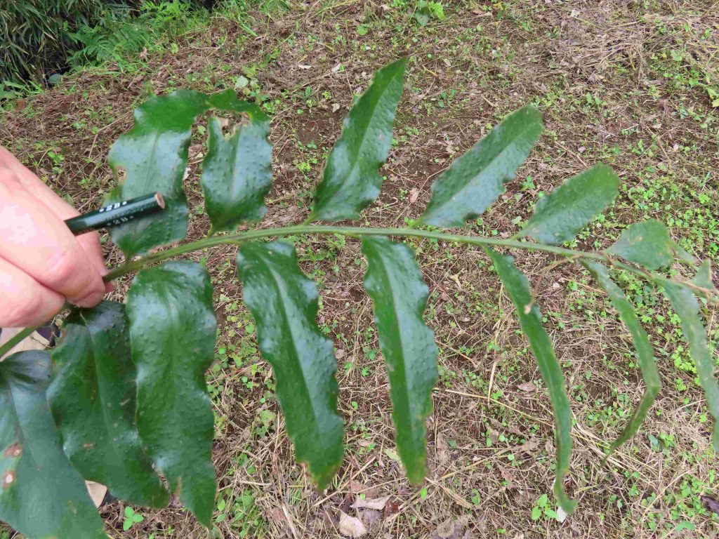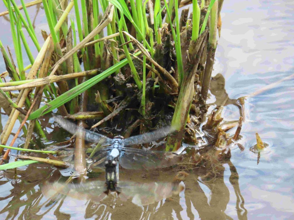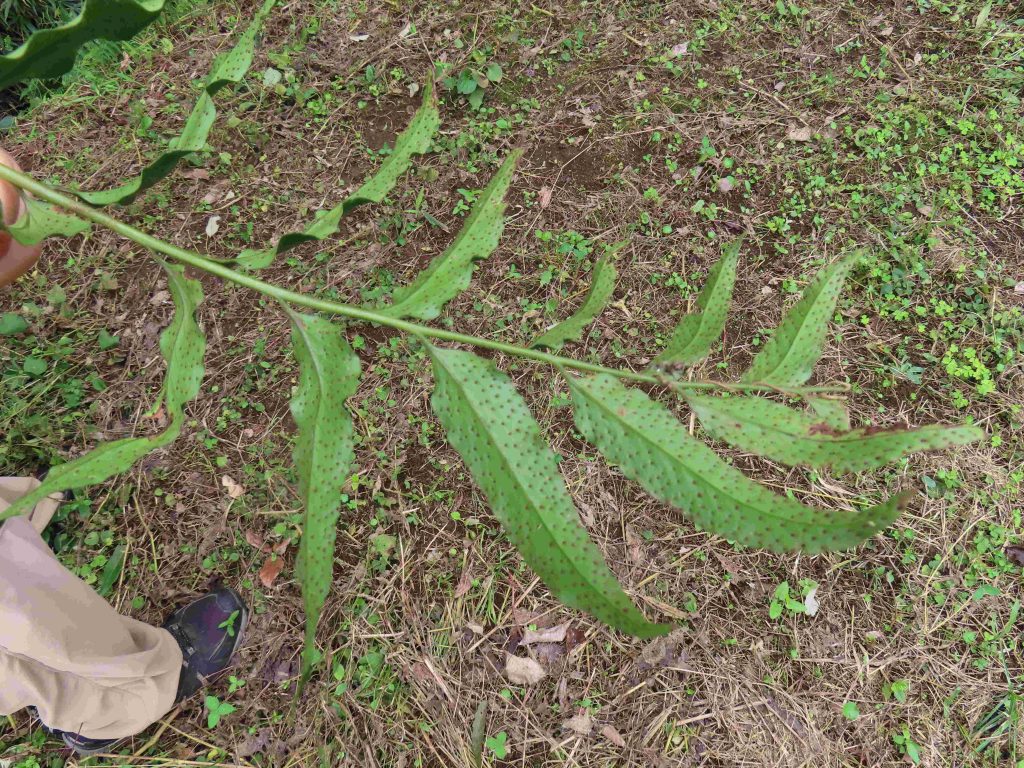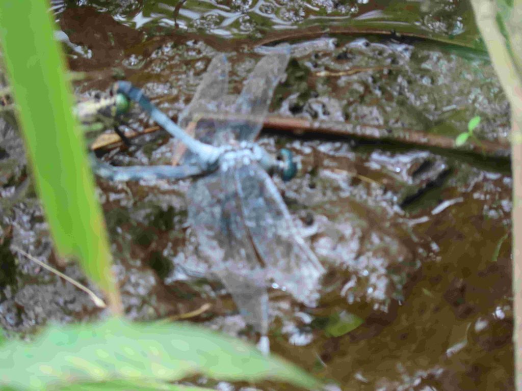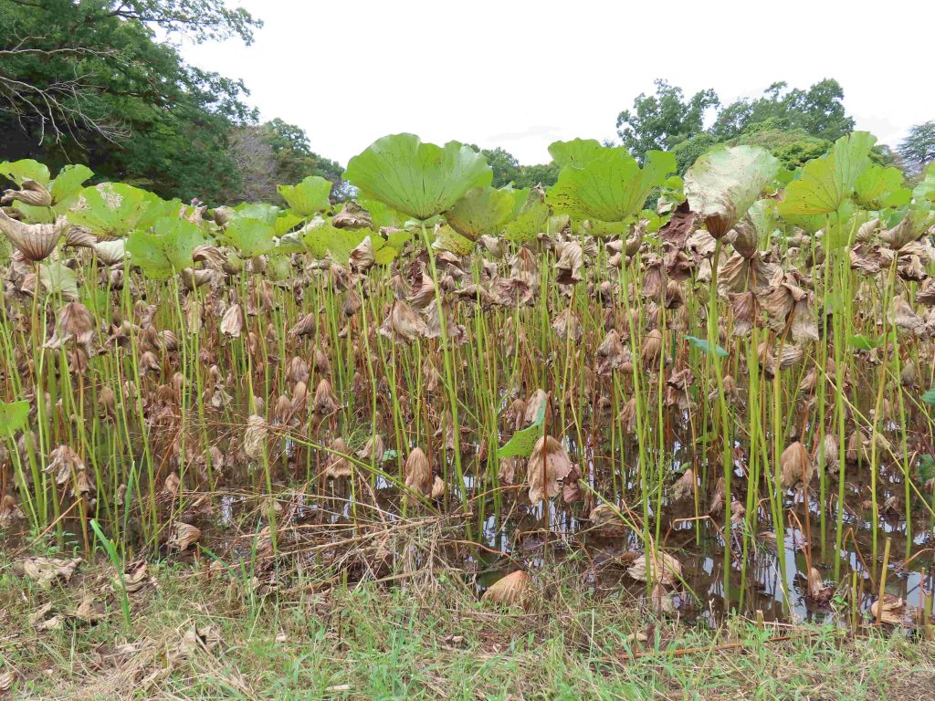 オオシオカラトンボの交尾(写真1)、不鮮明だが、シオカラトンボの交尾(写真2)、ノシメトンボ(写真3)、ツチイナゴ(写真4)、その幼虫(写真5)、シダ類のテリハヤブソテツ(写真6、7)をカメラに収めました。クサギ(写真8、9)が実を付けています。トチノキの実(写真10、11)が落下しています。ハス田は、こんなふうになっています(写真13)。