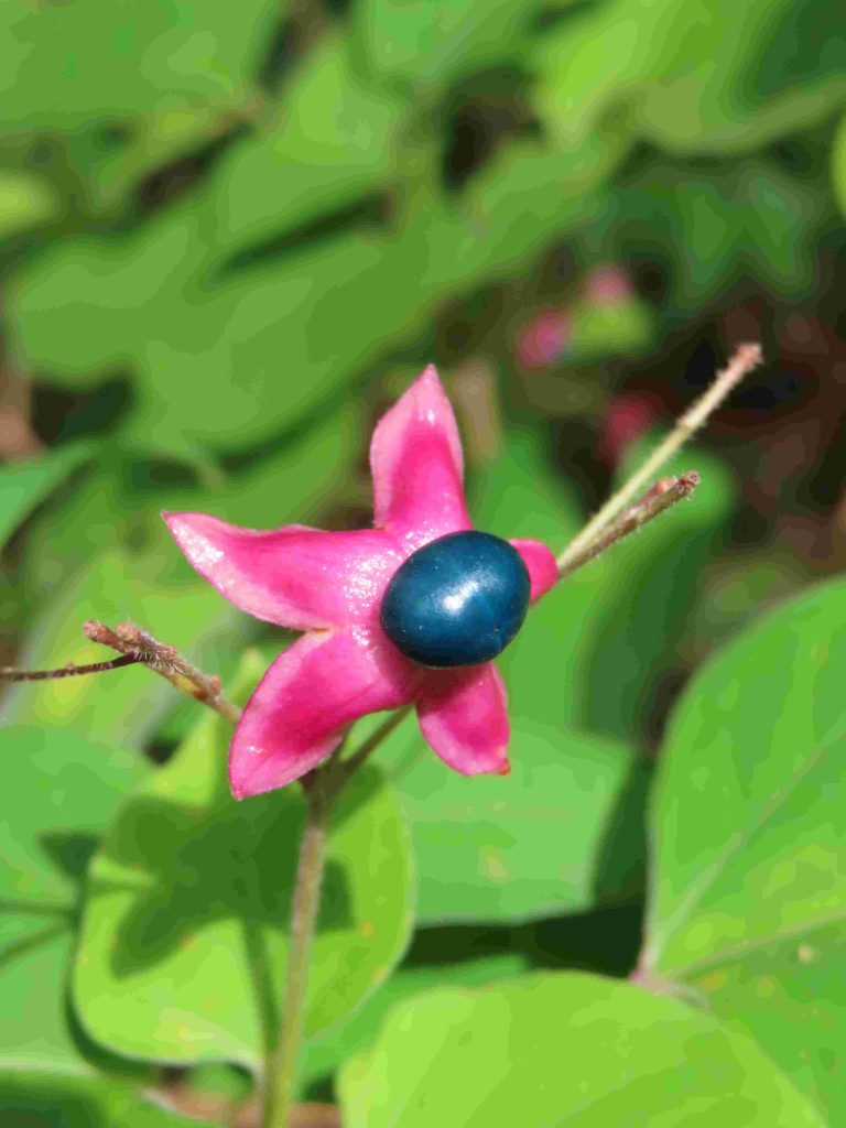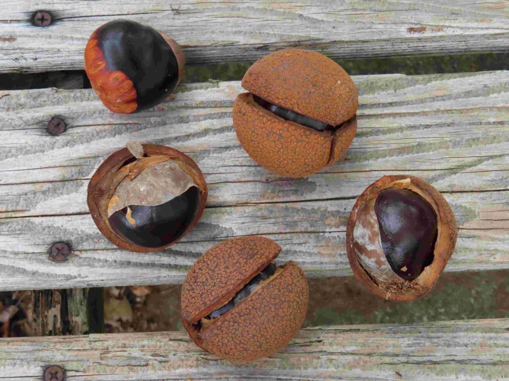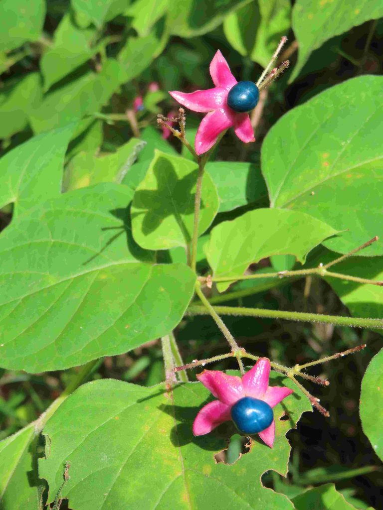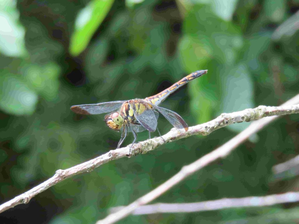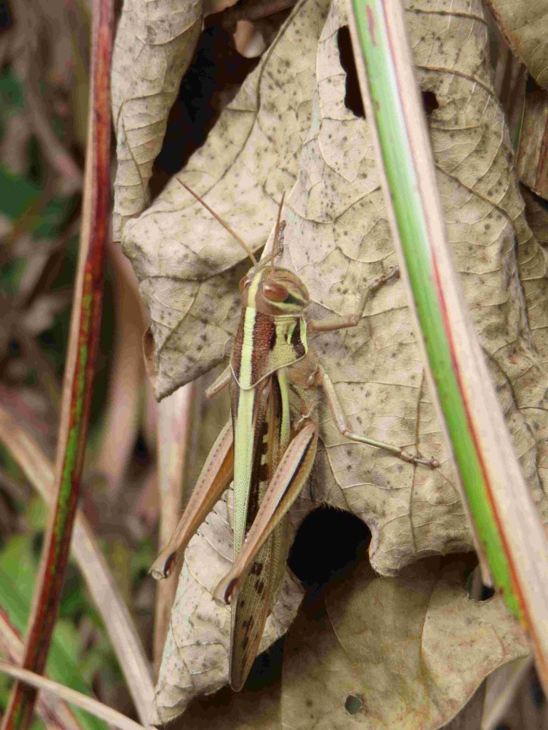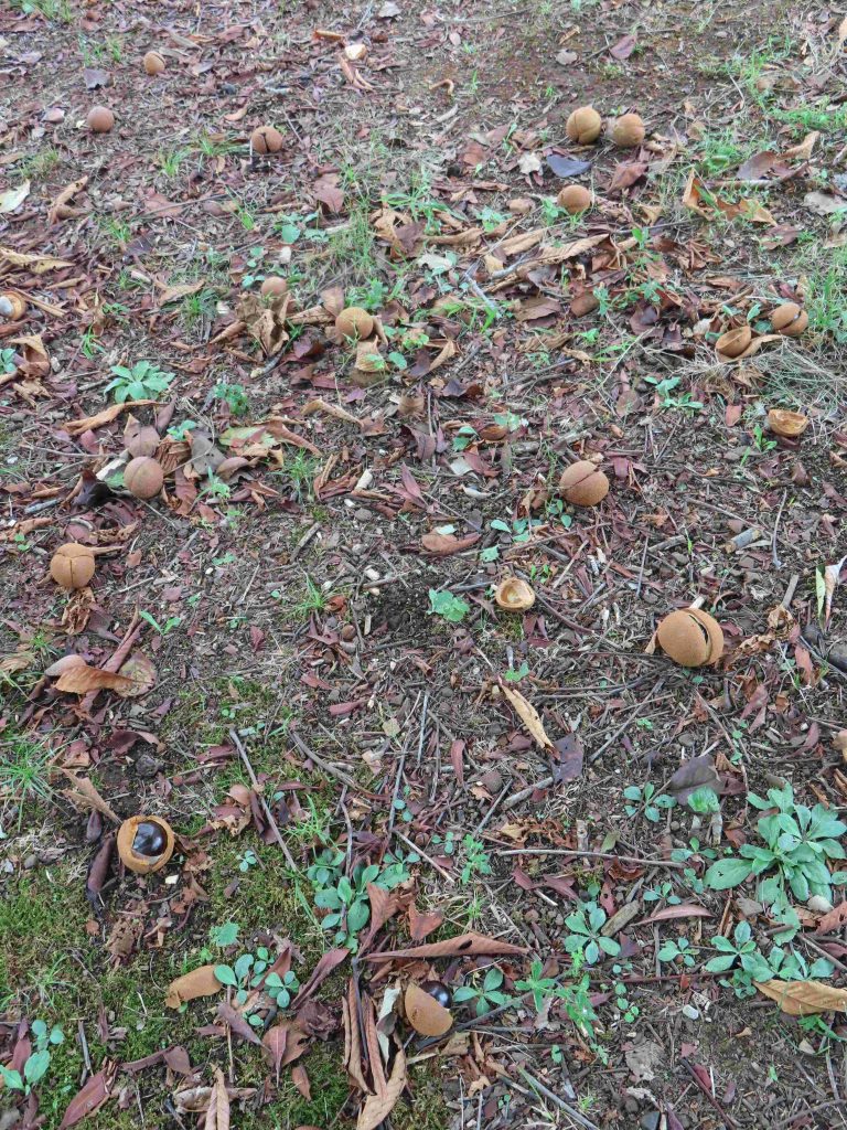 オオシオカラトンボの交尾(写真1)、不鮮明だが、シオカラトンボの交尾(写真2)、ノシメトンボ(写真3)、ツチイナゴ(写真4)、その幼虫(写真5)、シダ類のテリハヤブソテツ(写真6、7)をカメラに収めました。クサギ(写真8、9)が実を付けています。トチノキの実(写真10、11)が落下しています。ハス田は、こんなふうになっています(写真13)。