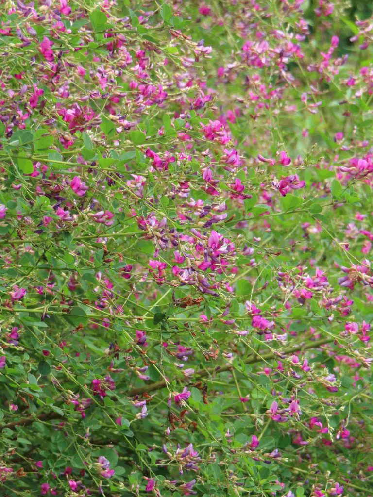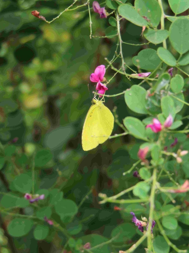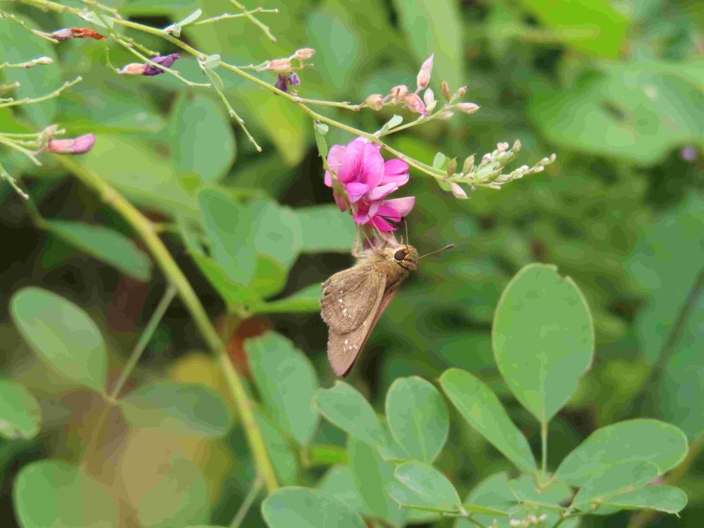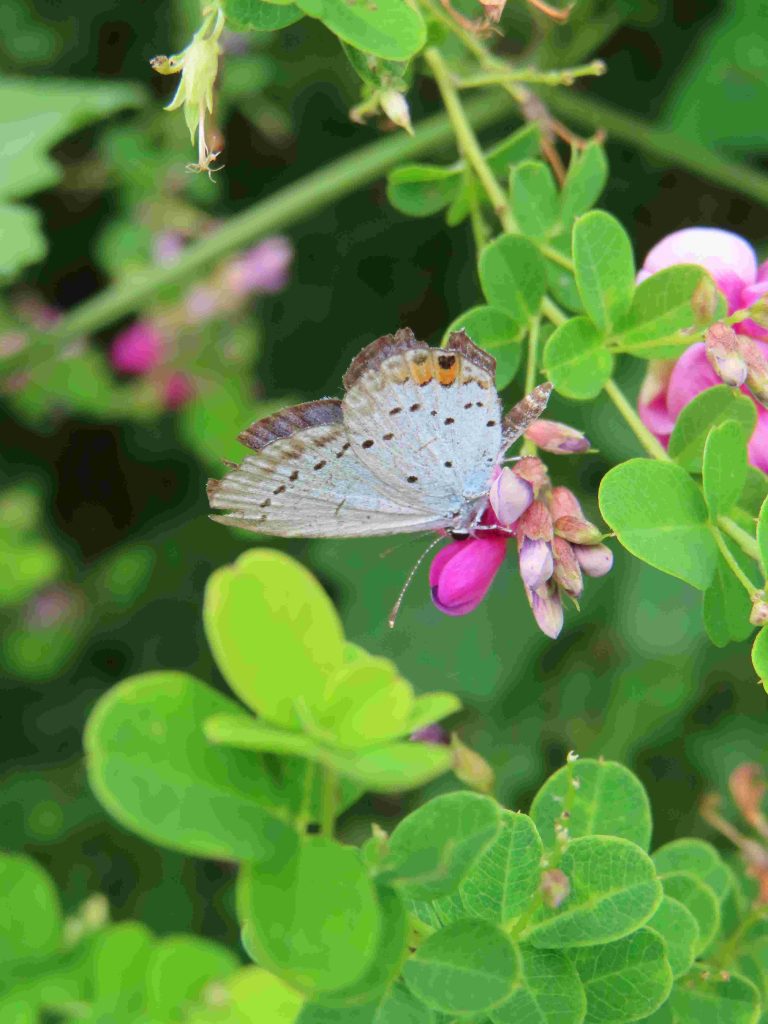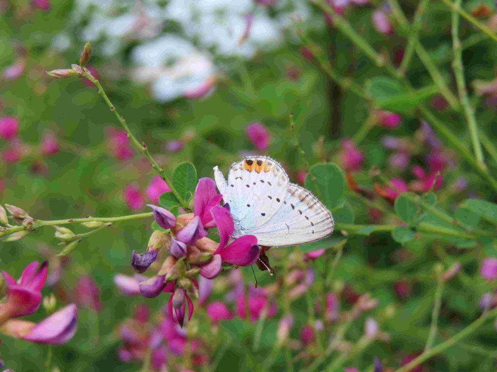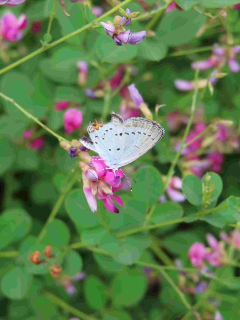 ヤマハギ(写真1、2)が咲いています。ヤマハギで吸蜜しようと、ツバメシジミ(写真3~5)、その雄(写真6)、ルリシジミの雄(写真7)、チャバネセセリ(写真8)、キタキチョウ(写真9)らが集合しています。