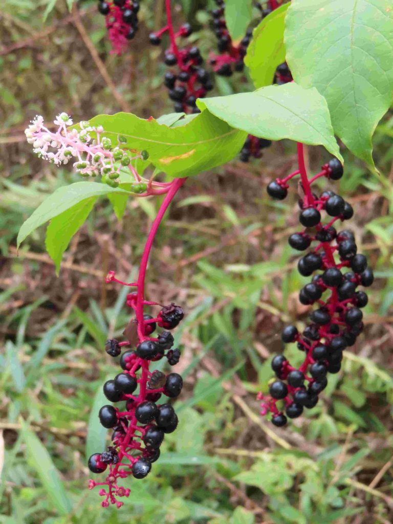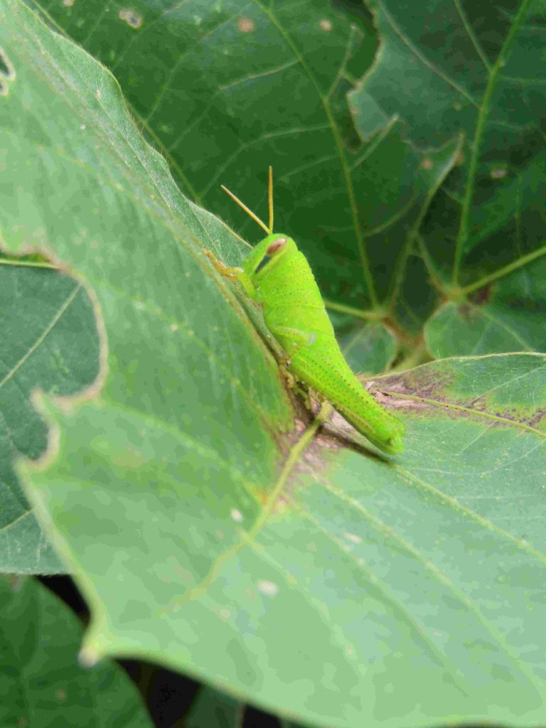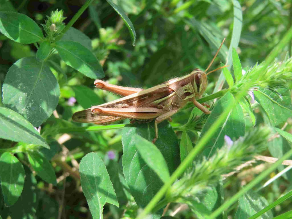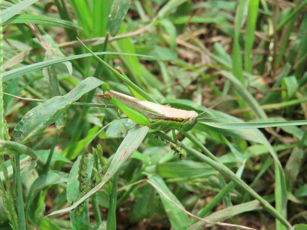コバネイナゴ(写真1)、ハネナガイナゴあるいはコバネイナゴ(写真2)、ツチイナゴ(写真3)、その幼虫(写真4)、ナナホシテントウ(写真5)をカメラに収めました。ヤブラン(写真6)、ノハラアザミ(写真7)が咲いています。ヨウシュヤマゴボウ(写真8、9)が花と実を付けています。
