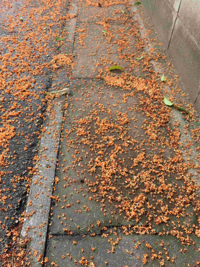 我が家の庭師(女房)から、ホトトギス(写真1)が咲き出したわよ、との報告あり。書斎脇のハナミズキ(写真2)が紅葉しています。我が家を芳香で包んでいたキンモクセイ(写真3)が落花しています。