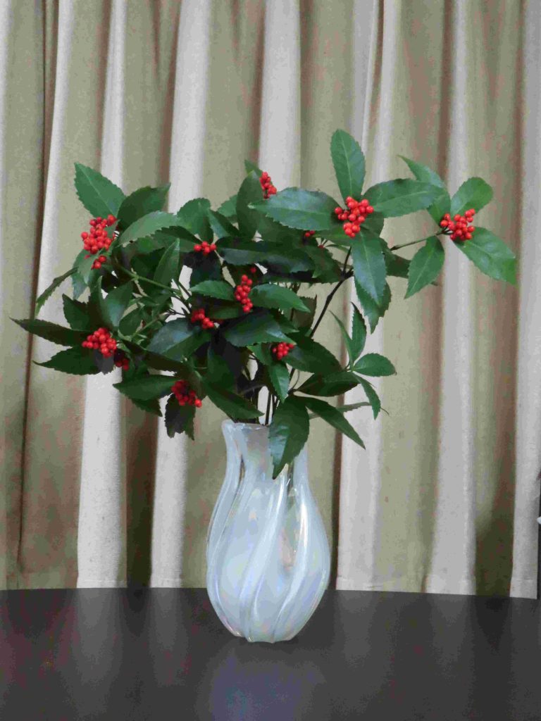 隣家の女主が持ってきてくれたセンリョウを花瓶へ。私の流派は自然無心流(笑)。因みに、本日の歩数は7,579でした。