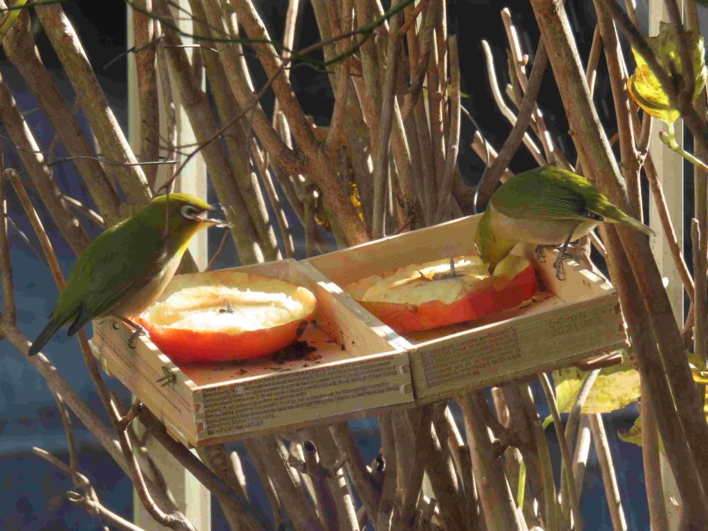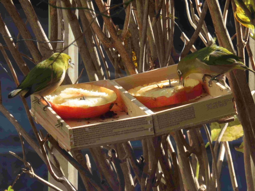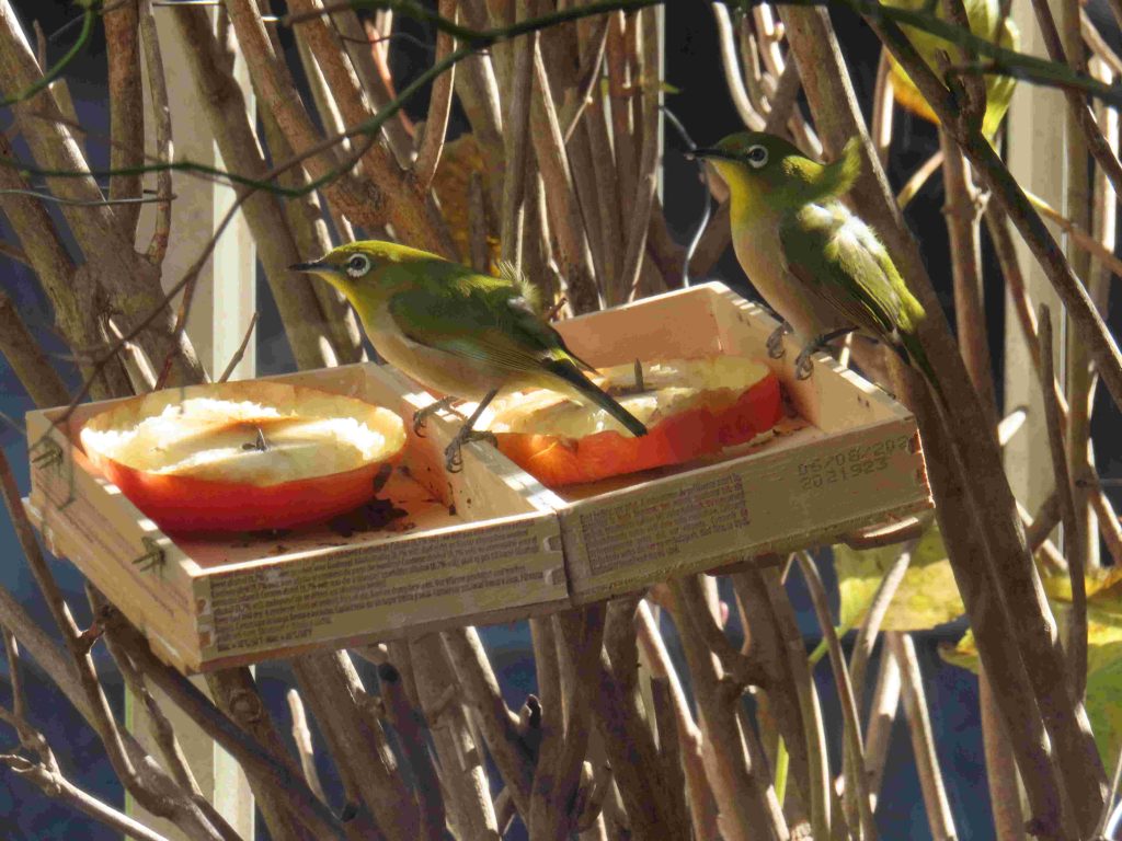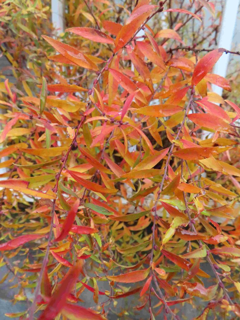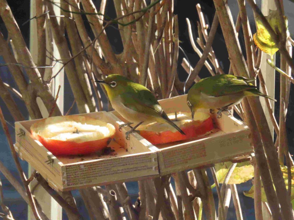 我が家のユキヤナギ(写真5)が紅葉しています。強風の中、餌台にメジロたち(写真6~11)がやって来ました。