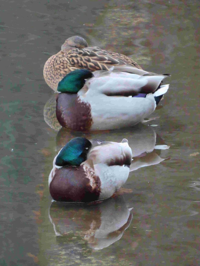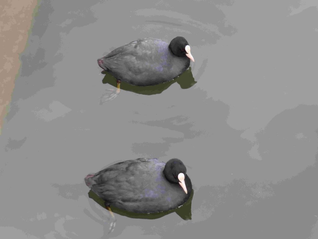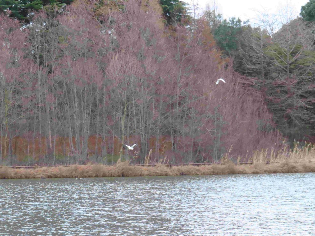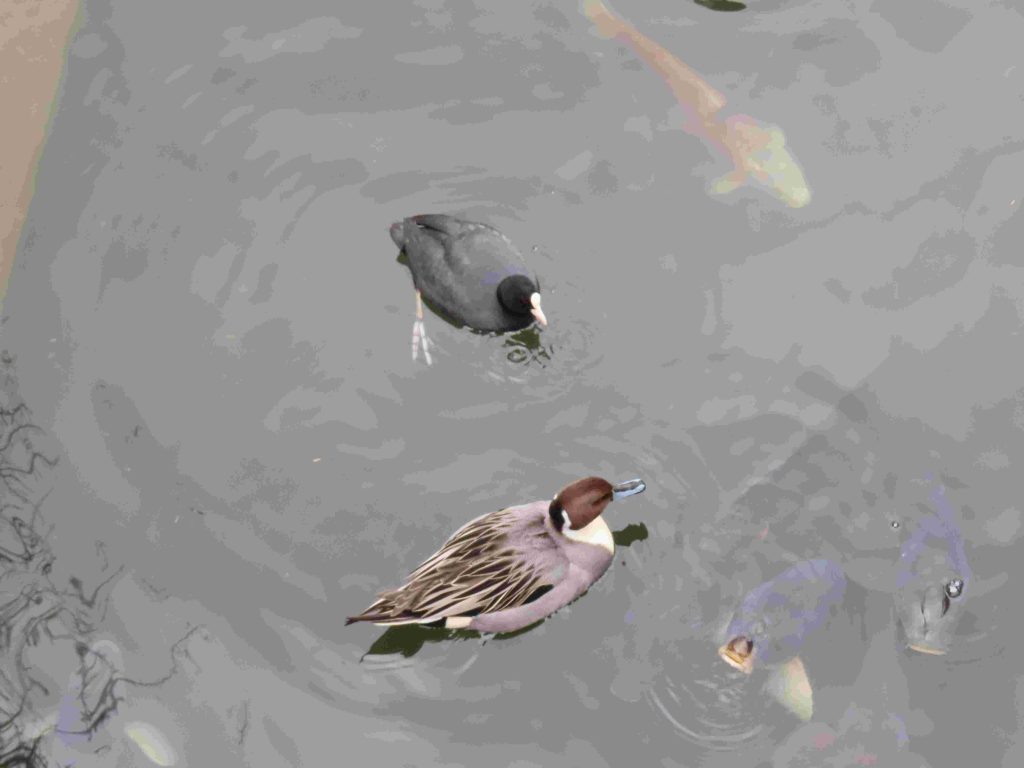 キジバト(写真1)、オオバン(写真2)、オオバンとオナガガモの雄(写真3)、オナガガモの雄(写真4)、マガモの雄と雌(写真5)、コサギ(写真6、7)、ダイサギ(写真8)をカメラに収めました。サザンカ(写真9~11)が咲いています。ネズミモチ(写真12、13)が実を付けています。