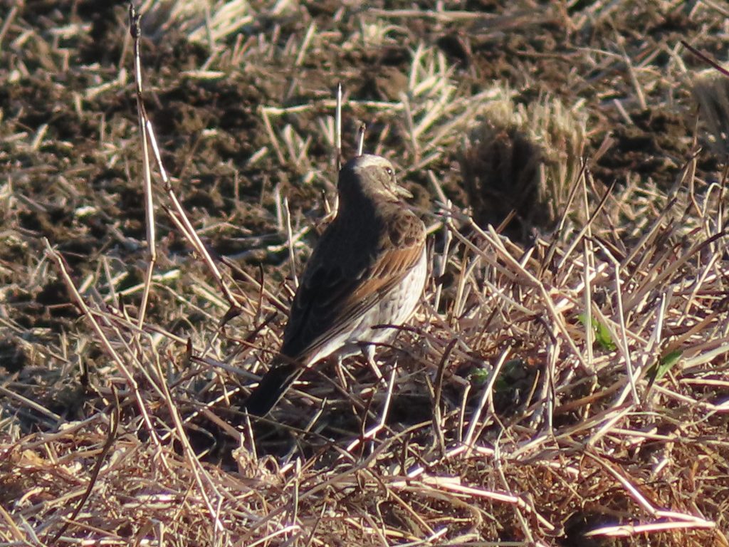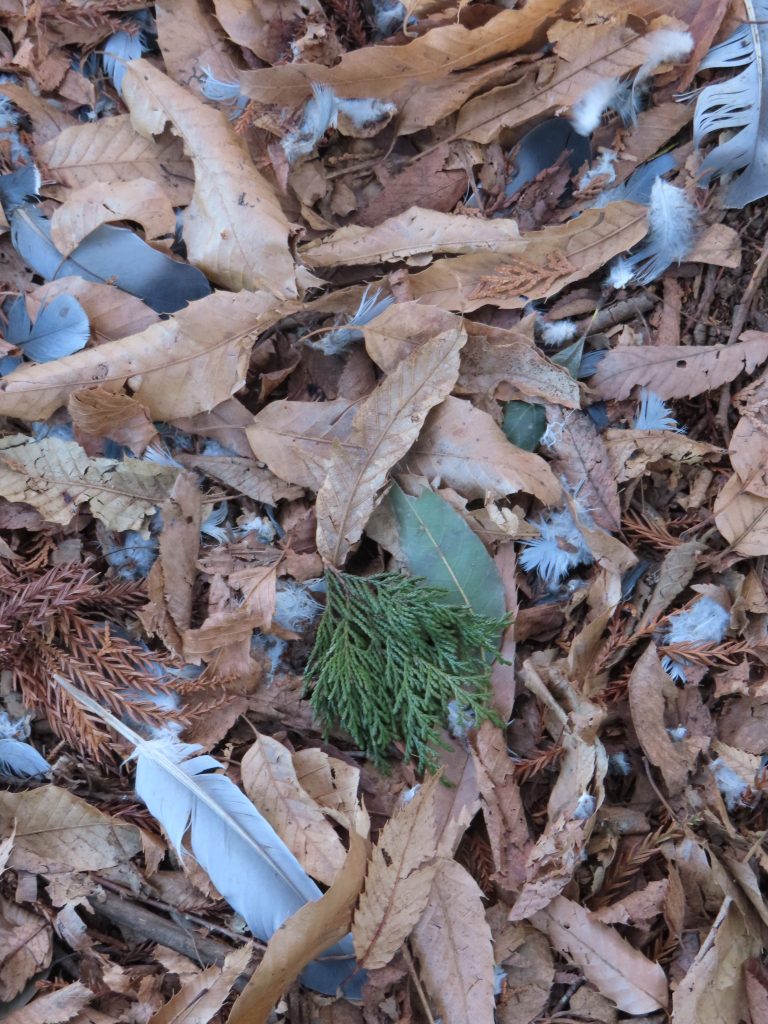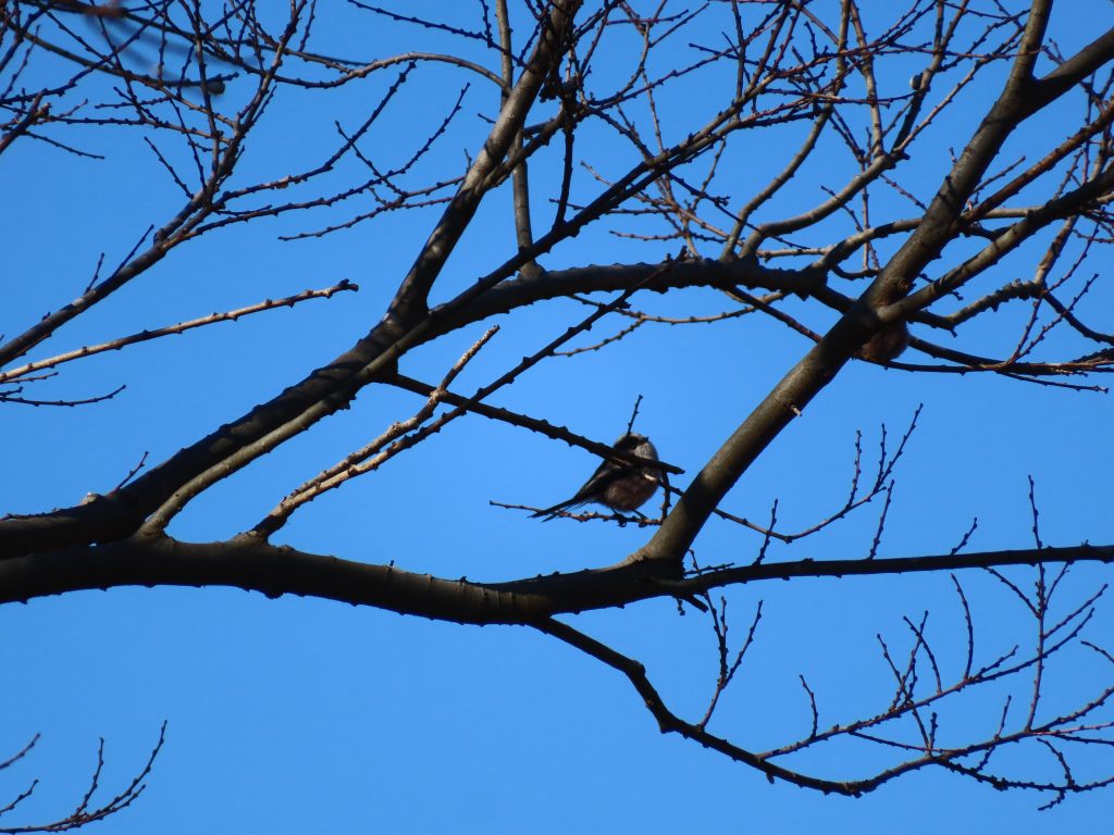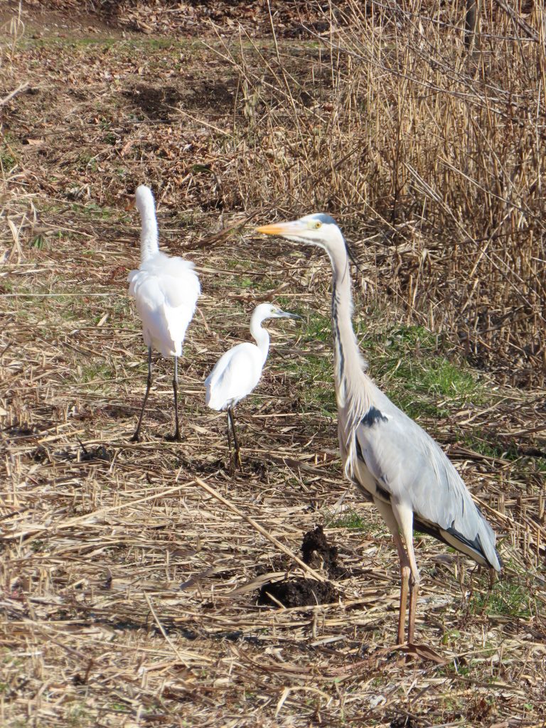 枝被りだが、エナガ(写真1)、ツグミ(写真2)、手前からアオサギ、コサギ、ダイサギの揃い踏み(写真3)、オオタカの食痕と思われるもの(写真4)をカメラに収めました。竹けん玉に挑戦し、見事に成功(写真5)。