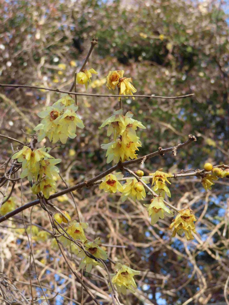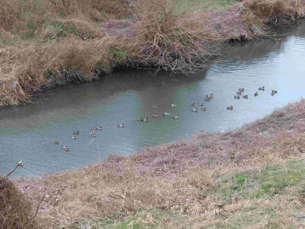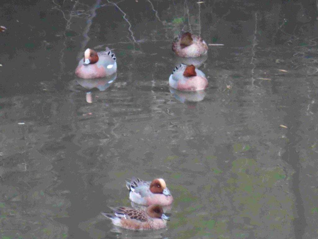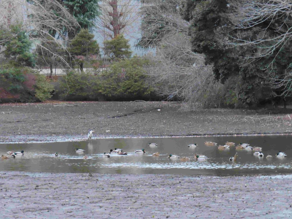 アオサギと、マガモの雄と雌(写真1、2)、ヒドリガモの雄と雌(写真3~5)、飛び石橋(写真6)をカメラに収めました。ロウバイ(写真7~11)が咲いています。