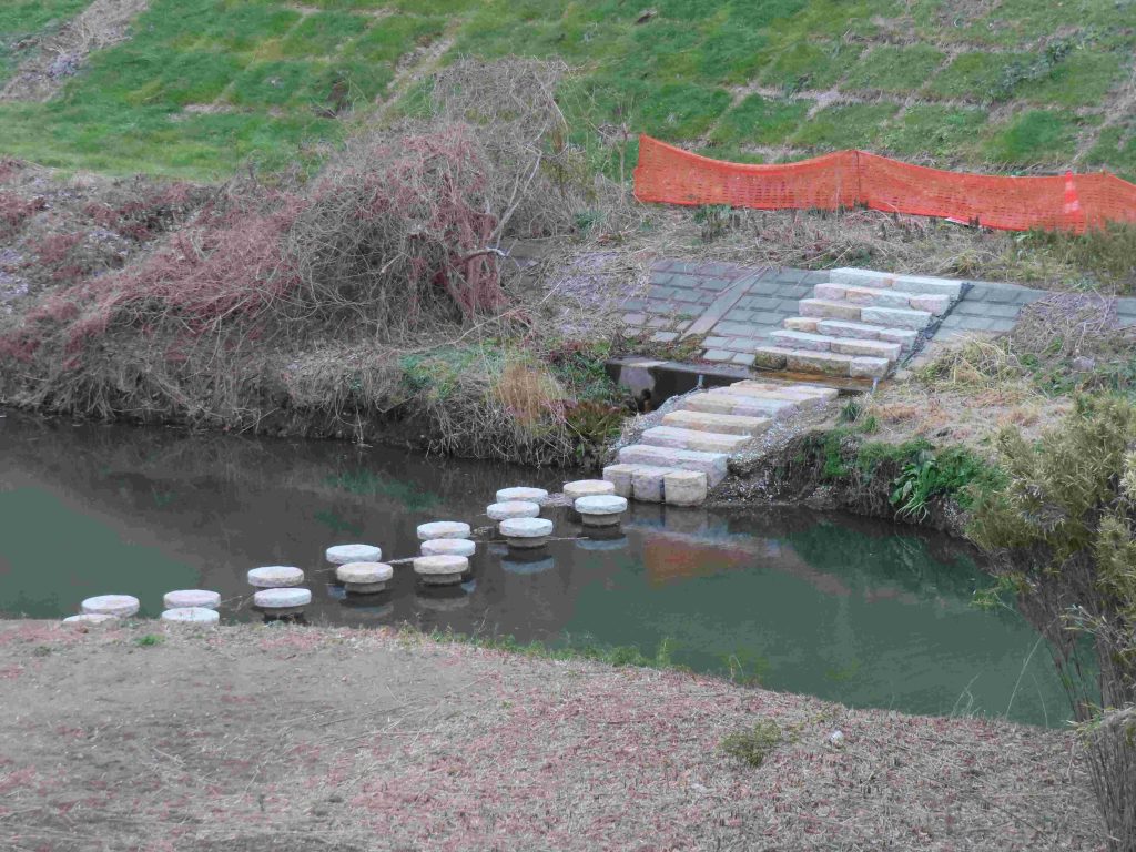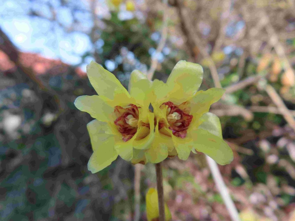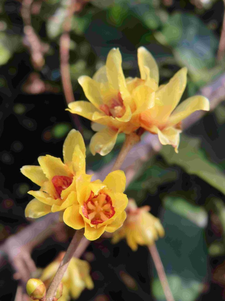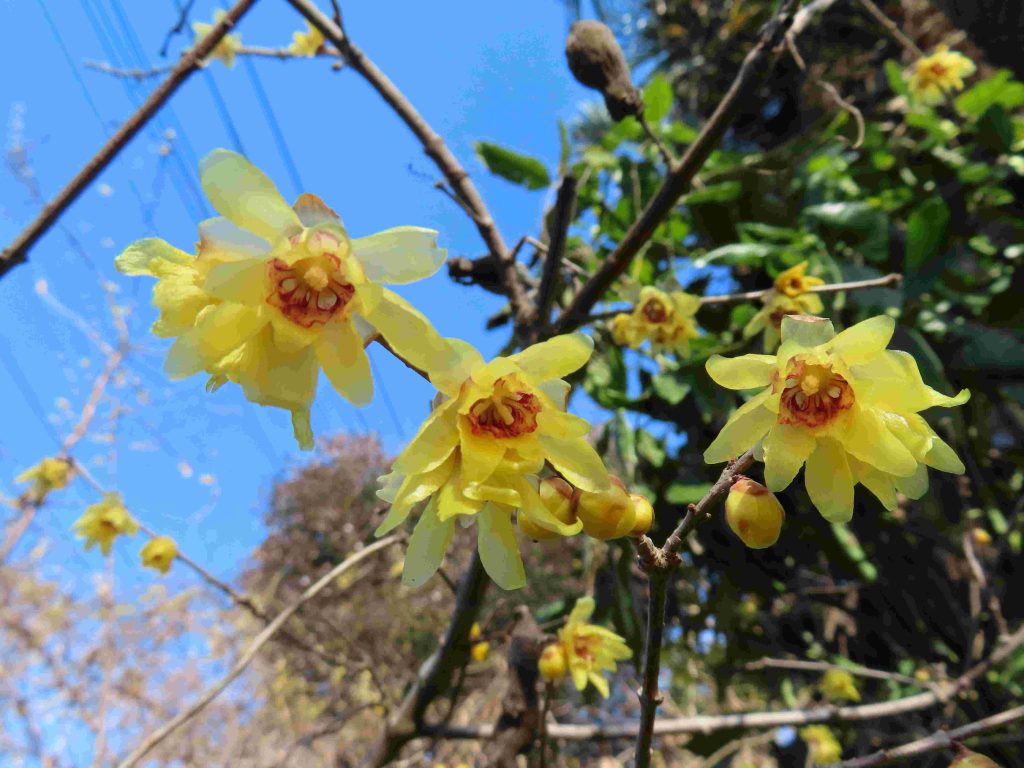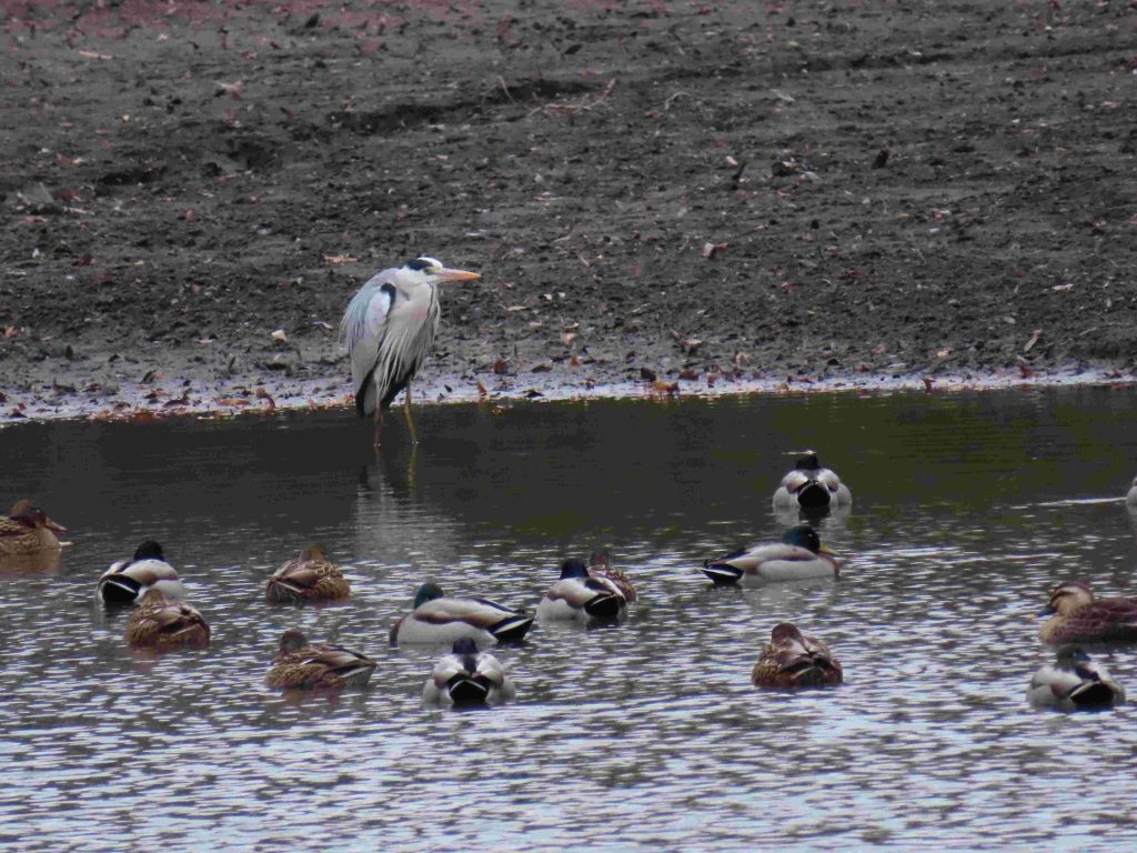 アオサギと、マガモの雄と雌(写真1、2)、ヒドリガモの雄と雌(写真3~5)、飛び石橋(写真6)をカメラに収めました。ロウバイ(写真7~11)が咲いています。