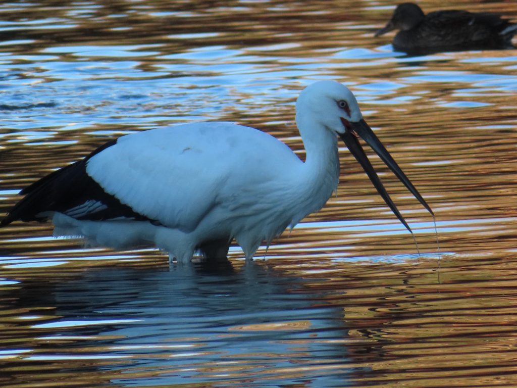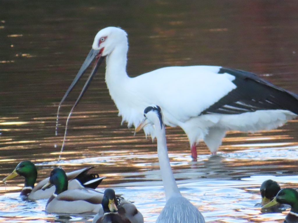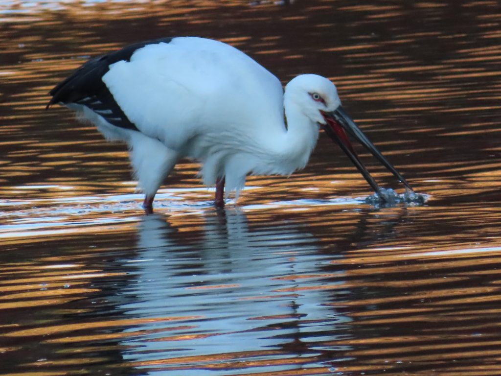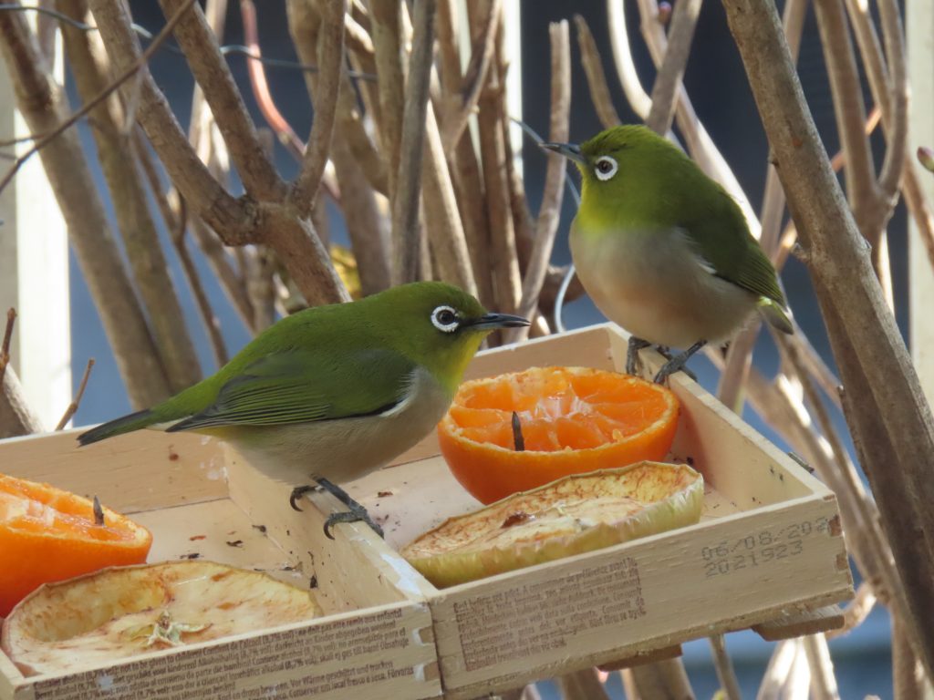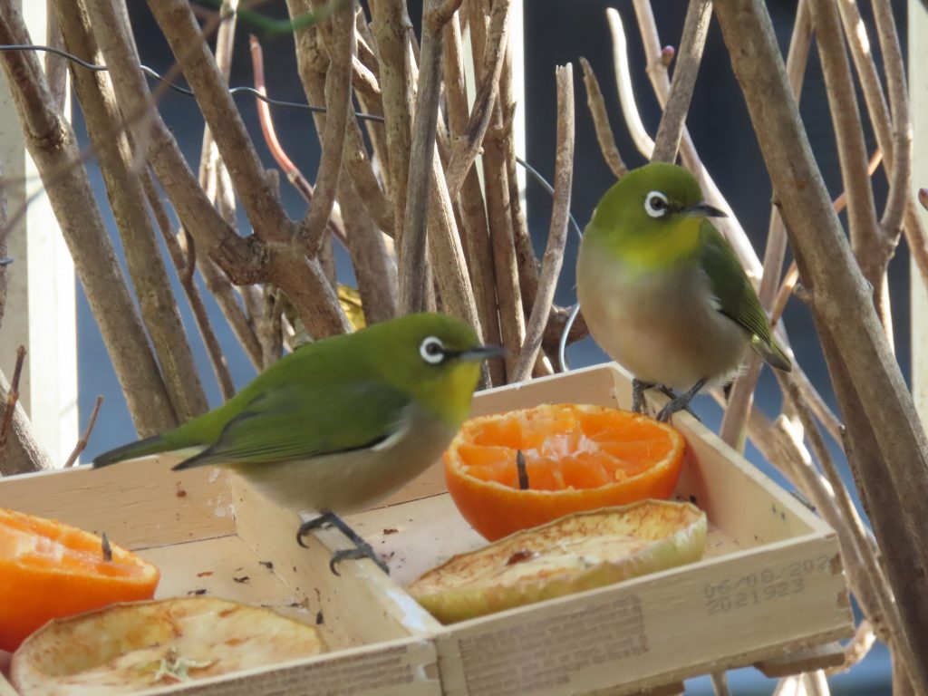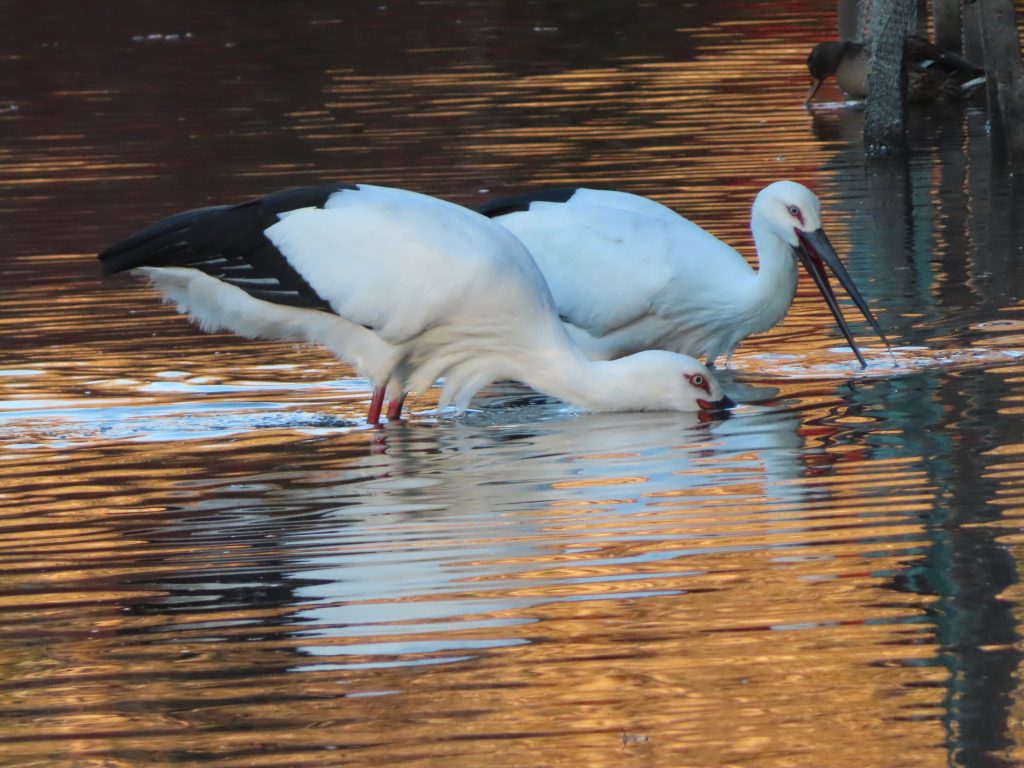 夜明け時のコウノトリ(写真1~7)。我が家の餌台のシジュウカラ(写真8)、スズメ(写真9~11)、メジロ(写真12~15)。