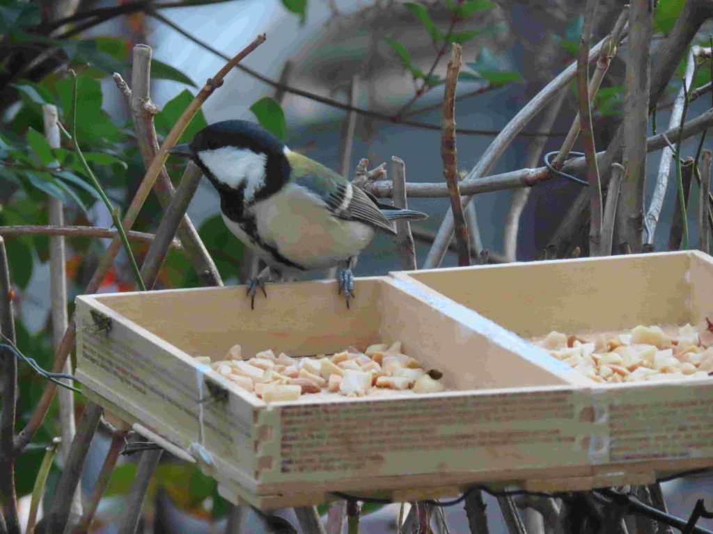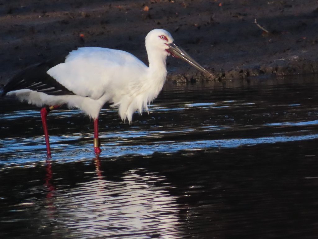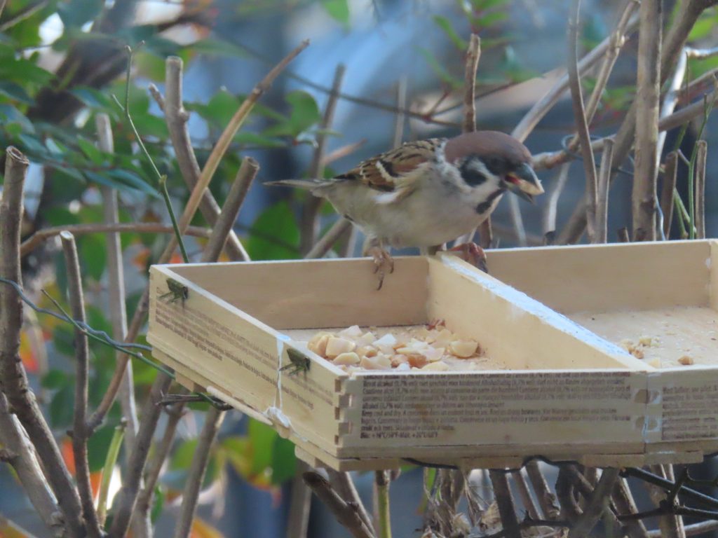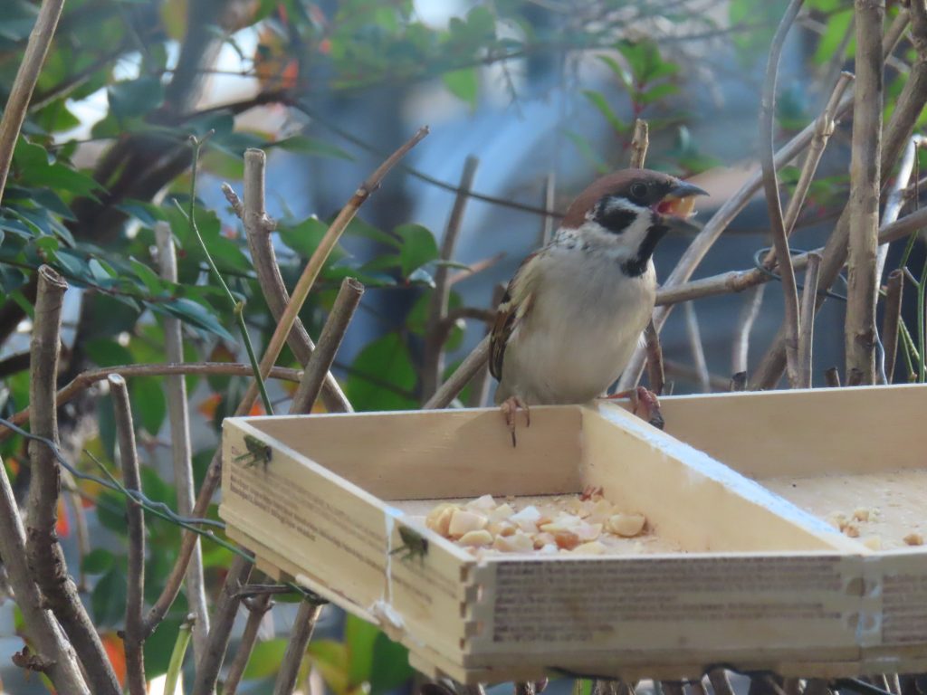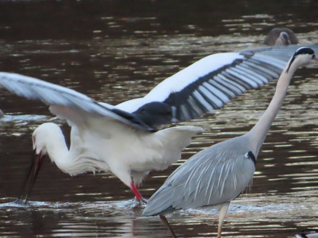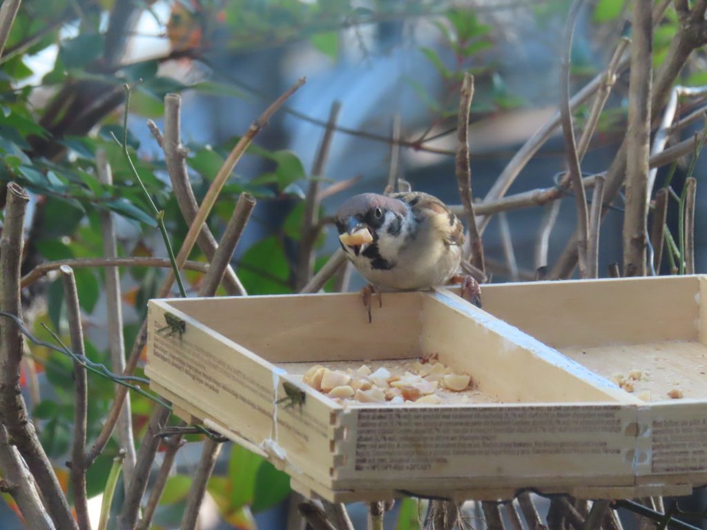 夜明け時のコウノトリ(写真1~7)。我が家の餌台のシジュウカラ(写真8)、スズメ(写真9~11)、メジロ(写真12~15)。