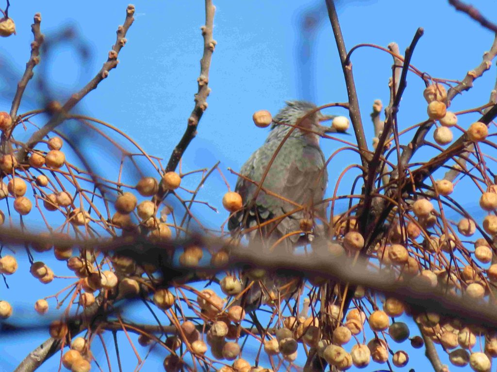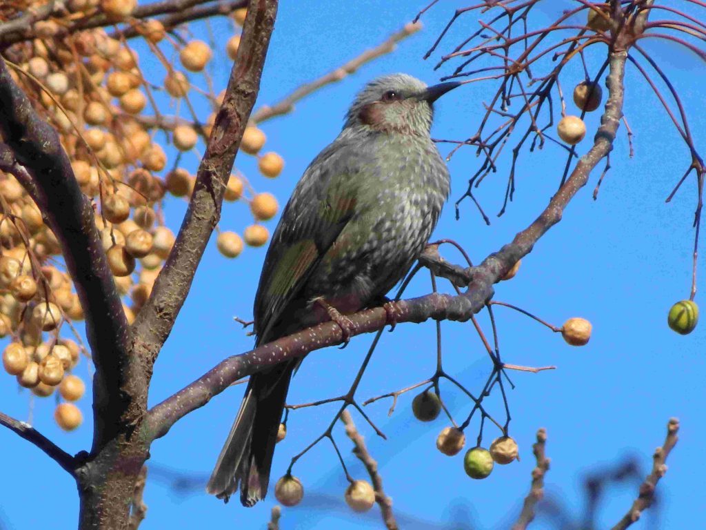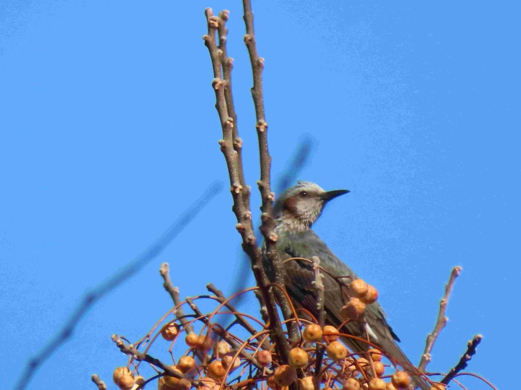 スズメ(写真1)、ツグミ(写真2、3)、センダンの実を啄むヒヨドリ(写真4~6)をカメラに収めました。