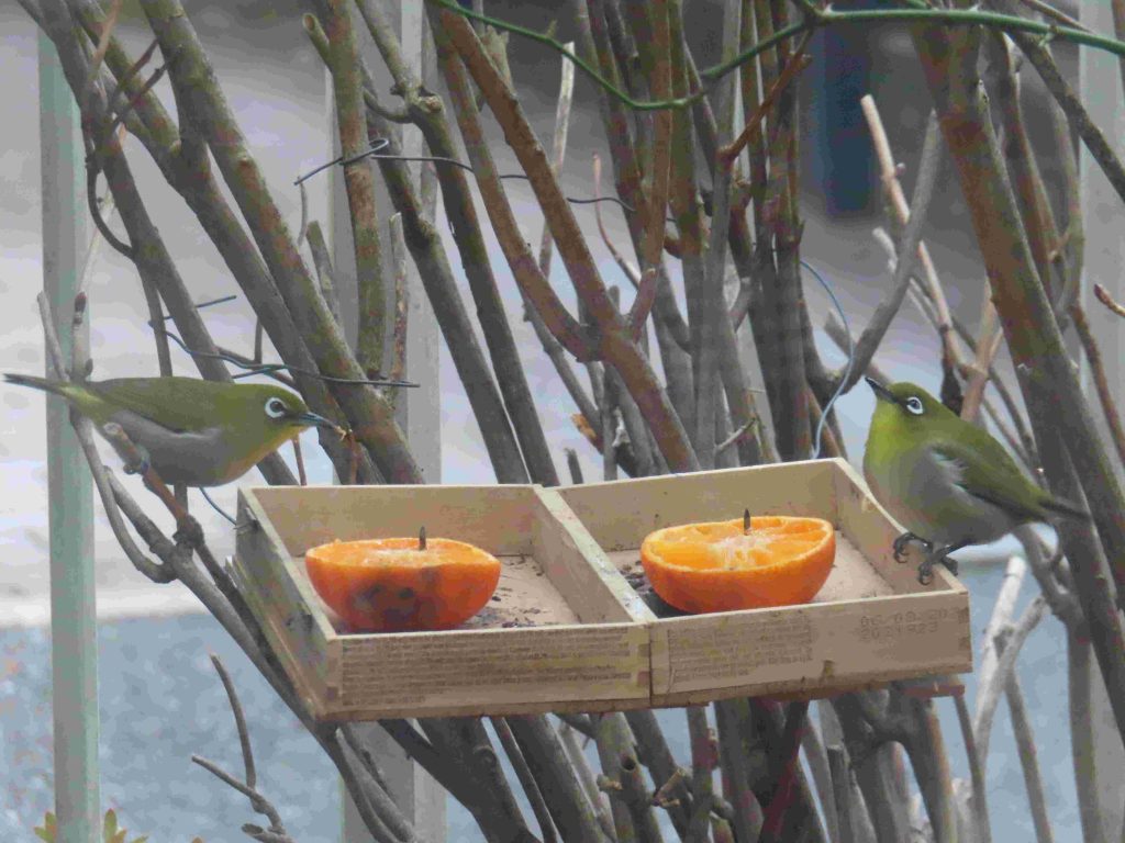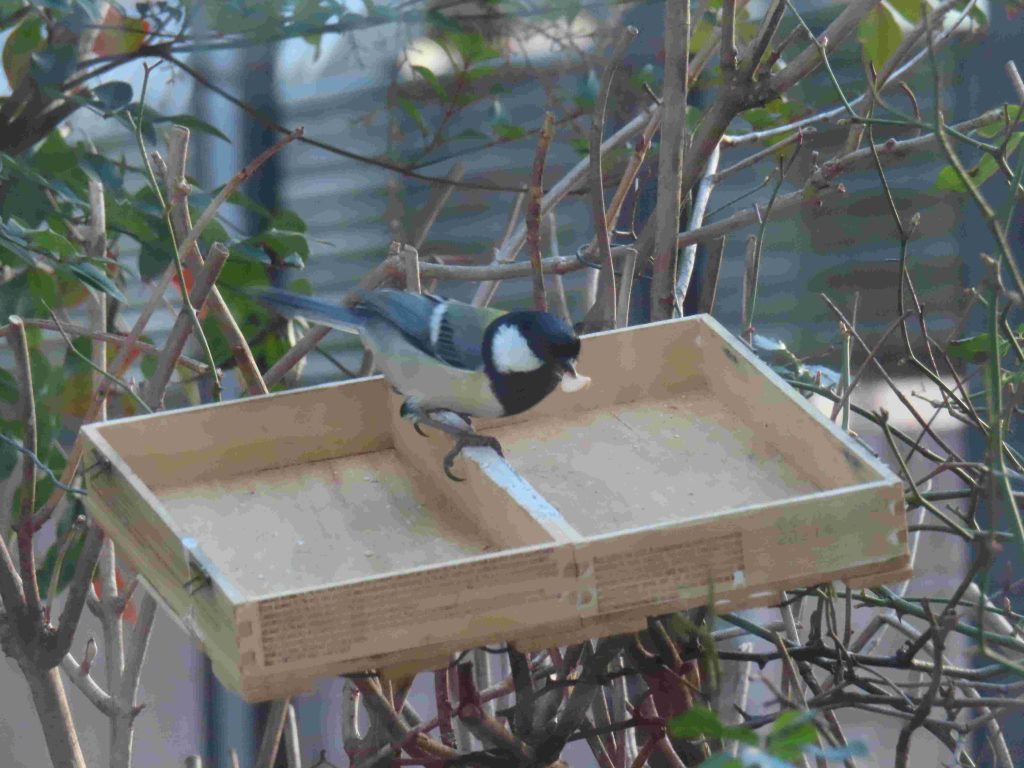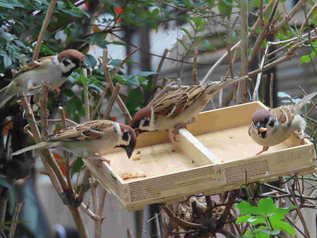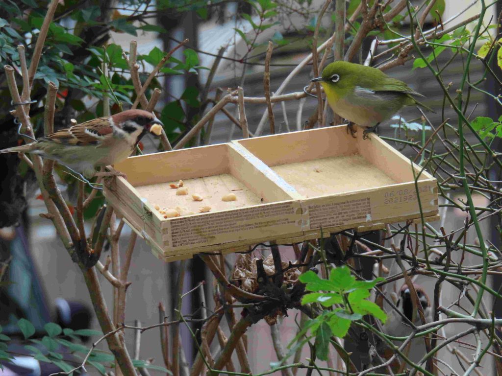 我が家の餌台の常連のシジュウカラ、スズメ、メジロたち。