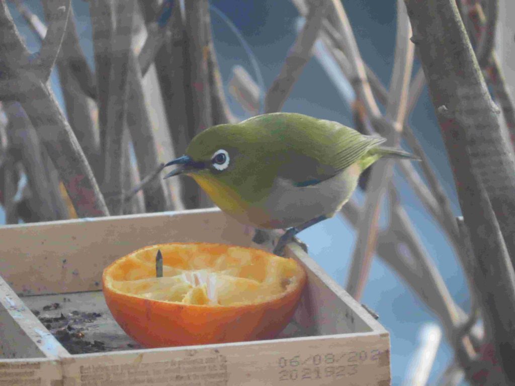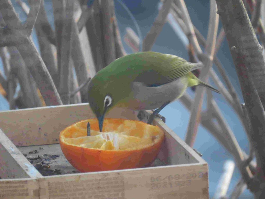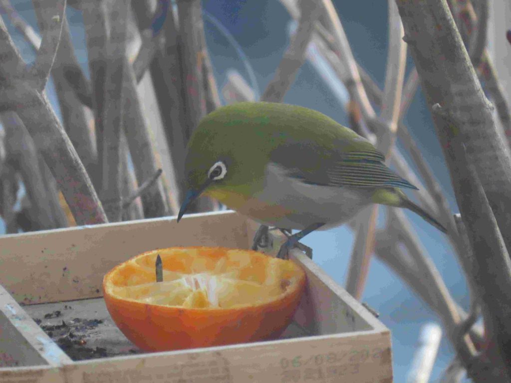 ツグミ(写真1)をカメラに収めました。我が家の餌台の常連のメジロ(写真3~6)。