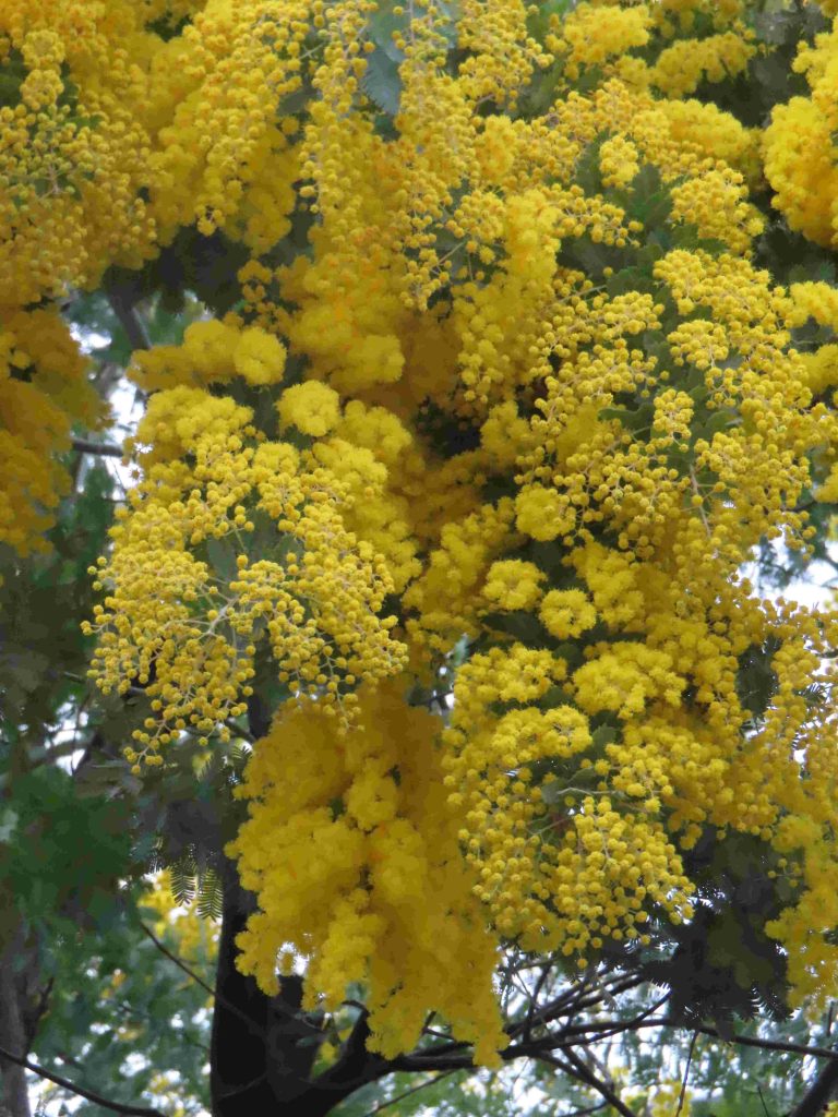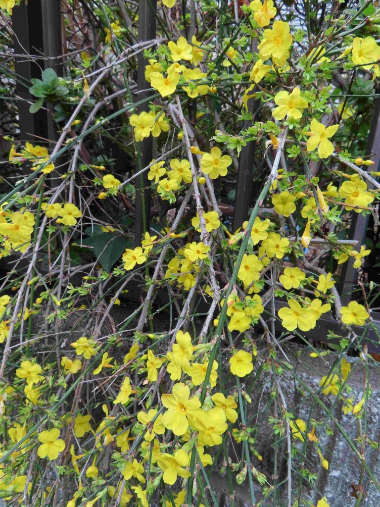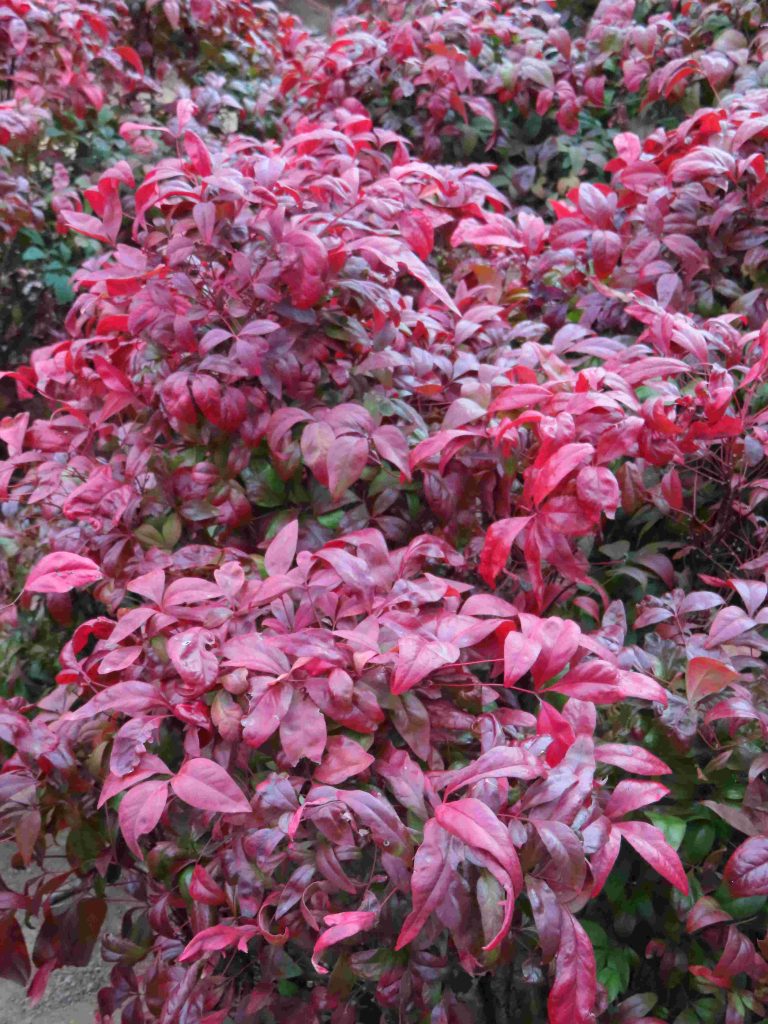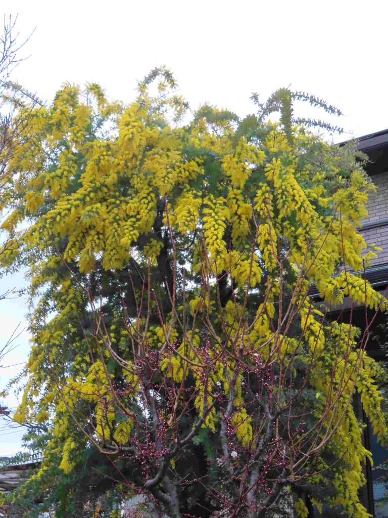 オウバイ(写真1、2)、ギンヨウアカシア(別名:ミモザ。写真3、4)が咲いています。オタフクナンテン(写真5)が紅葉しています。