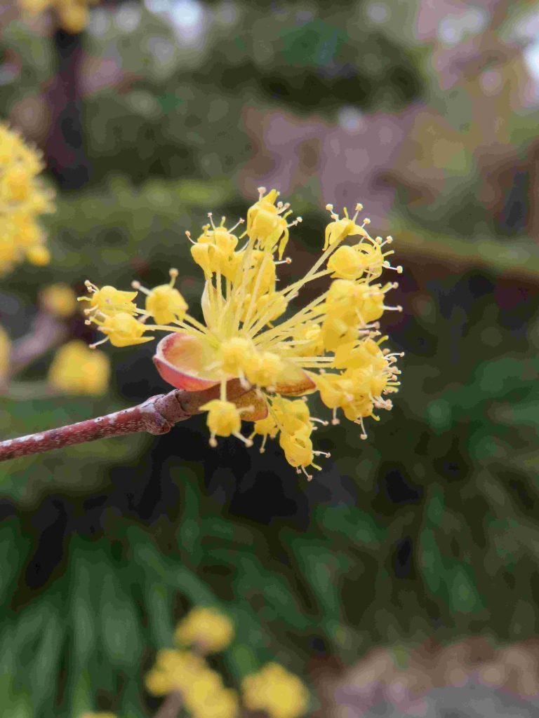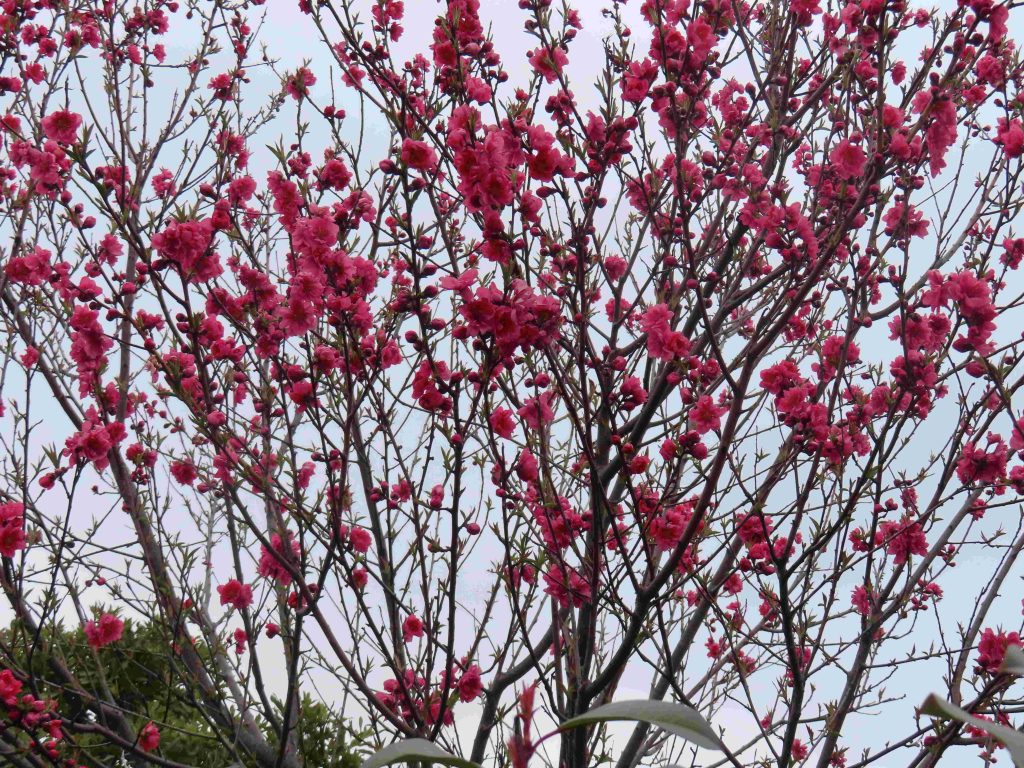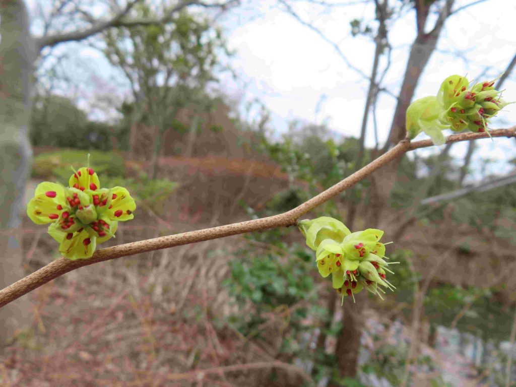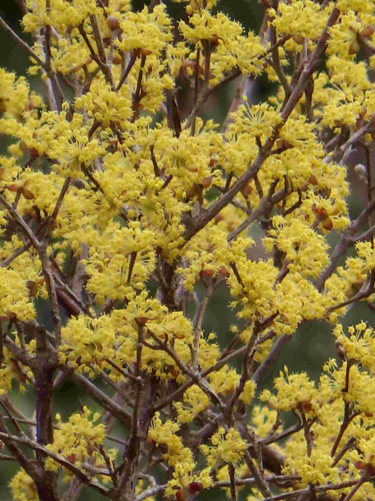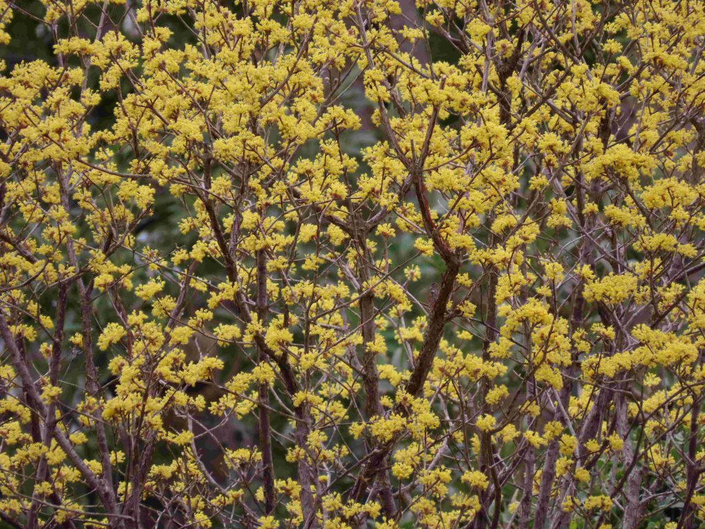 サンシュユ(写真1~4)、ハナモモ(写真5~8)、ネコヤナギの雄花(写真9、10)、トサミズキ(写真11、12)が咲いています。ヒュウガミズキ(写真13)は開花寸前です。